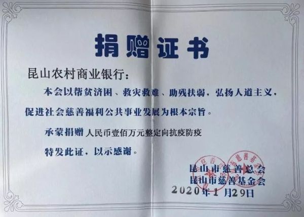 疫情就是命令,防控就是责任。为进一步助力新型冠状病毒疫情防控,1月29日,昆山农商银行以慈善基金会名义向昆山市慈善总会捐赠100万元人民币,定向用于抗疫防疫。