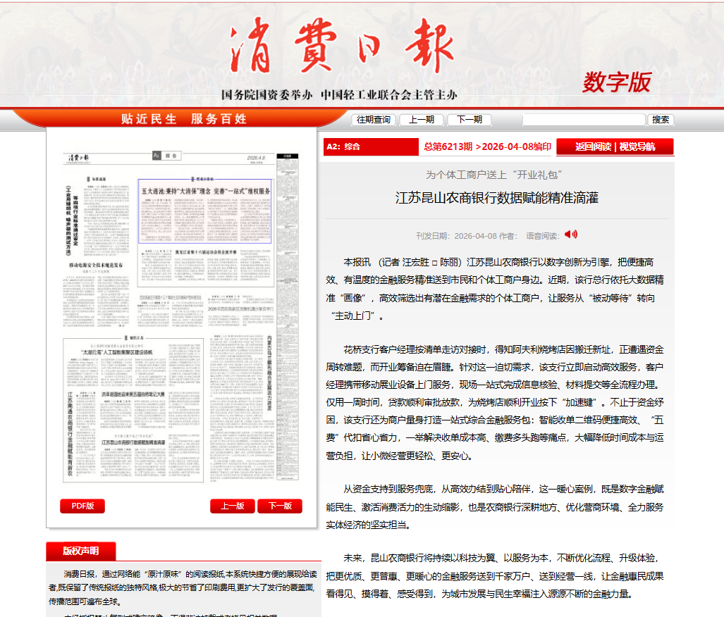 【消费日报】江苏昆山农商银行数据赋能精准滴灌