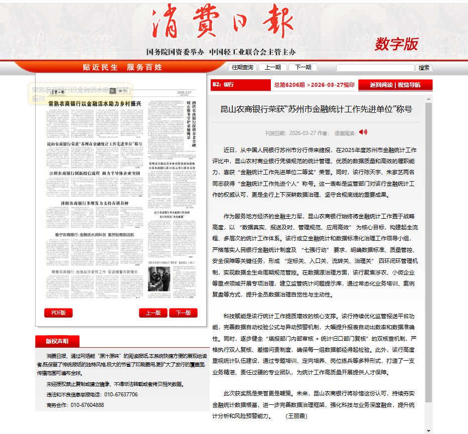 【消费日报】昆山农商银行荣获“苏州市金融统计工作先进单位”称号